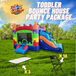 This package includes 1 Soft Play Package and The Mini Block Party Toddler Bounce House, with 3 rectangular tables and 18 chairs! Add a 10x20 tent for $120!