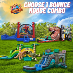 T-Rex 5 in 1 Dual Lane ComboUltimate Bounce House/ Waterslide Combo package #3W:T-Rex 5 in 1 Dual Lane Combo102866687_2334104_24798431100 Unleash the adventure with our *5-in-1 T-Rex Dinosaur Bounce House Water Slide Combo*! This thrilling inflatable is a prehistoric paradise featuring a towering T-Rex and vibrant dinosaur-themed graphics. Kids can bounce, climb, slide, and even shoot hoops in this action-packed combo unit. Whether used as a dry bounce house or transformed into a water slide for extra splashy fun, it’s perfect for dinosaur-themed parties or any event where excitement is key. With five different activities to enjoy, this inflatable promises endless fun and exploration for little adventurers. Safe, durable, and easy to set up, it’s a roaring good time for everyone!