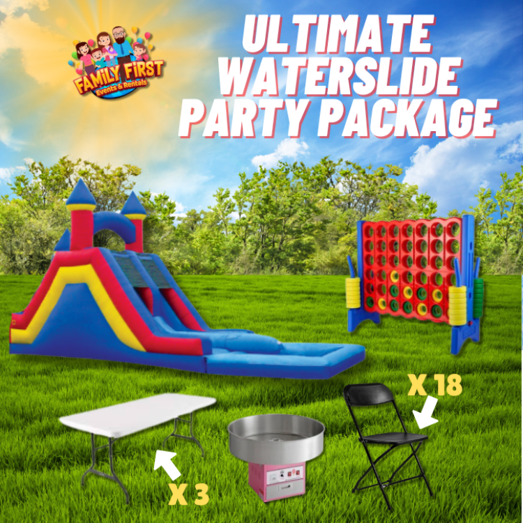 Extra Snowcone ServingsUltimate Waterslide package #1B:Extra Snowcone Servings102334146_1524893_26989150000The initial rental comes with 50 servings of cups and flavoring. Additional Servings maybe add upon request. Each additional 50 servings can be added for $35. 10 FT x 20 FT Frame Tent Package (18 B & 3 - 6 FT)Ultimate Waterslide package #1B:10 FT x 20 FT Frame Tent Package (18 B & 3 - 6 FT)102334146_2982629_16336610000 10-foot X 20-foot Framed Tent. Comes with 3 6 ft Rectangle Tables and 18 Chairs. Add a Tent Wall or Tent Lights. Tent Drapery is also available.
